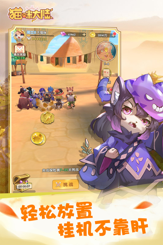 猫咪大陆是一款超可爱的萌系策略放置手游,带你进入一个全是猫咪的奇幻世界。游戏的背景设定在祥喵界,但这里突然遭到了食梦魔的入侵,而你作为被选中的喵界守护者,需要带领各种萌萌的小猫咪一起对抗敌人,维护喵界的和平。和其他游戏不同,这款游戏采用了独特的萌系3D画风,画面超级精致,猫咪们也都设计得各有特色,每一只都让人忍不住想撸一把!玩法上更是颠覆了传统放置游戏,把策略玩法和轻松养成完美结合,资源产出超多,玩起来一点都不肝,再加上丰富的福利系统,简直是爱猫人士和休闲玩家的天堂。