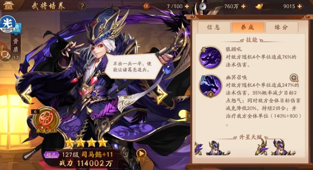 围绕曹操的特点来组建队伍。曹操自身够硬朗,放在前排抗伤害很稳当,他的技能带减怒效果,能打乱对手节奏,是队伍的控制核心。给他搭配荀彧特别关键,这位谋士的流血效果伤害可观,一次性能打掉敌人不少血量。再配上曹节,她的法术暴击能力超强,和荀彧的流血配合起来,一回合就能把敌人血量压到危险线。主角推荐选带控制效果的时装,能帮队伍稳住局面。最后别忘了带上司马懿,他的治疗能力就像个贴心奶爸,能保证队伍续航,让亲们走得更远。合击技能优先选月影蝶舞,它能帮队伍解除负面状态,关键时刻能救命;魔灵咆哮在挑战高难度关卡时也记得升满,威力提升非常明显。