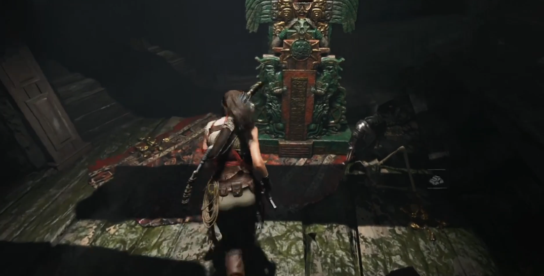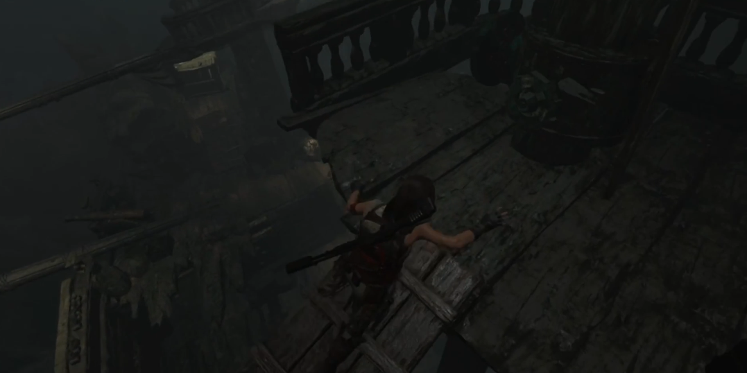 首先跳到木筏上然后想办法通过船体的裂缝爬到船里面去。这个挑战的最终目的,是想办法打开前面一个卡住的木栏,从而进入木栏下方。解谜过程需要你在船上进行一系列攀爬和摆荡。跳入船中央的水池,撬开铁门游到另一边,再利用船上的木板缝隙爬上去,借助左侧的横杆摆荡到高处。你需要走到左侧倒下的桅杆那头,用钩斧挂住前方岩壁爬上去,再从桅杆右侧爬,左转沿横杆跳上岩壁。在一条路的尽头,再次用钩斧索降下去,并摆荡到对面的横杆上。