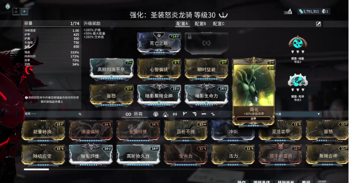 配置龙甲时建议堆叠强度类MOD如盲怒和瞬时飞驰,以及持续时间MOD来延长技能生效时间,携带狂暴化MOD可以通过血量转换管理能量消耗。赋能选择上消磁赋能能有效防御磁力异常,能量颜色设置为红色可使二技能提供生命回复效果,进一步提升团队生存能力,空位可考虑添加暗影纤维增强护甲或简化MOD优化技能循环。