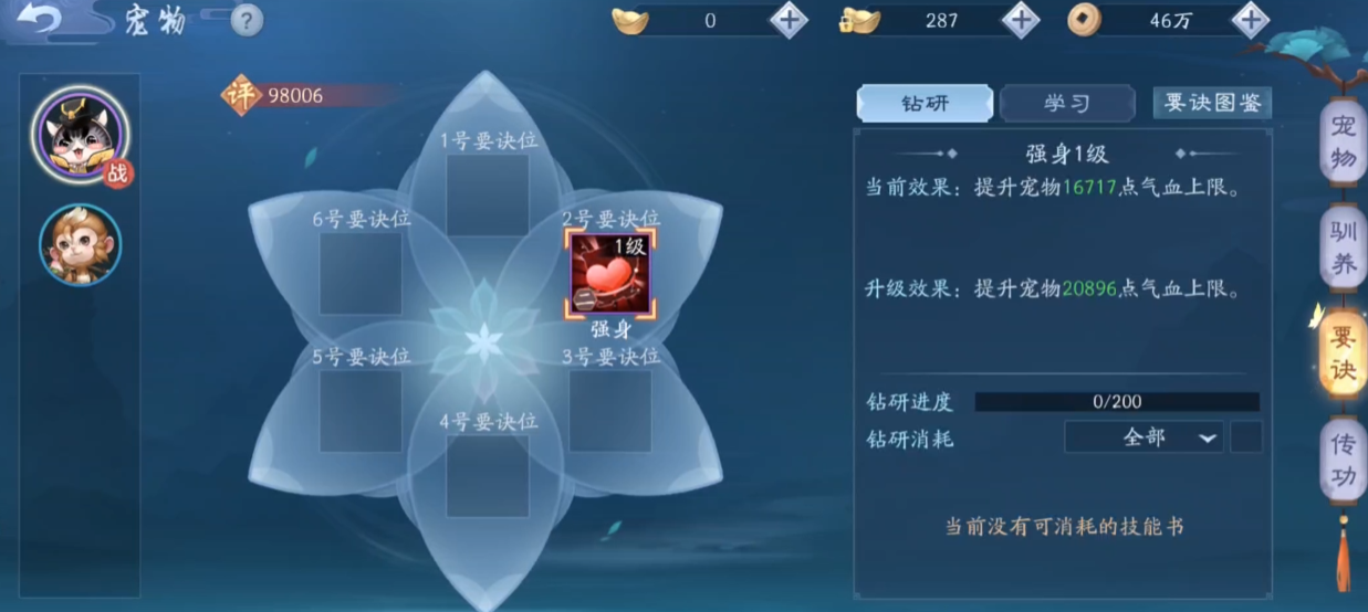 技能品质分为蓝色、紫色、橙色三个等级,品质直接影响效果强度。橙色专属要诀如九霄狼王的万狼奔腾具有改变战局的能力,但需通过寻龙探宝或拍卖行获取。紫色通用要诀如精准资质提升更适合平民玩家,通过日常副本即可积累。需注意宠物携带技能数量存在上限,盲目堆砌技能反而不如精准搭配。
