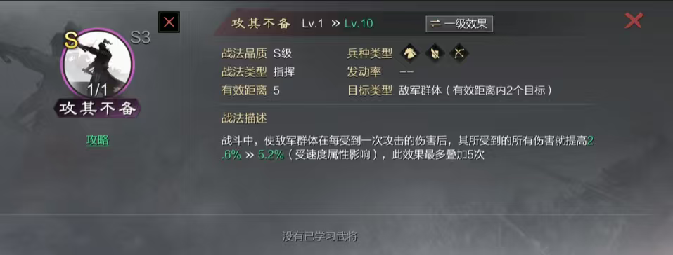 战法分配是曹操发挥效用的关键环节。他适合携带反计之策和攻其不备的组合。前者能限制敌方主动战法的释放,后者则可提升全队的爆发伤害。如果需要增强生存能力,也可以选择一夫当关配合青囊秘要等防御型战法。有些玩家喜欢给曹操配置神兵天降和大赏三军,这能大幅强化队伍前三回合的战斗力。另一种思路是采用单骑救主加反计之策的搭配。这种组合能显著提升团队的承伤能力。当曹操担任前锋时,防御型战法的收益会更加明显。携带衡轭的武将速度必须快过曹操,否则无法享受到完整的加成效果。