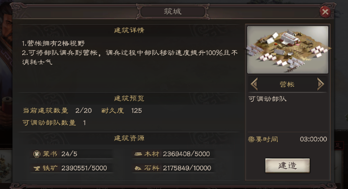 营帐的建造过程需要消耗策书和时间,一级营帐通常需要消耗五个策书和三个小时的建造时间,在建造过程中系统不允许使用任何加速功能,你必须耐心等待这三个小时结束后营帐才会正式建成,如果你想快速获得营帐可以使用二十个金猪立即完成建造,不过这种加速方式需要消耗珍贵的付费货币,建议在紧急战况下才考虑使用。