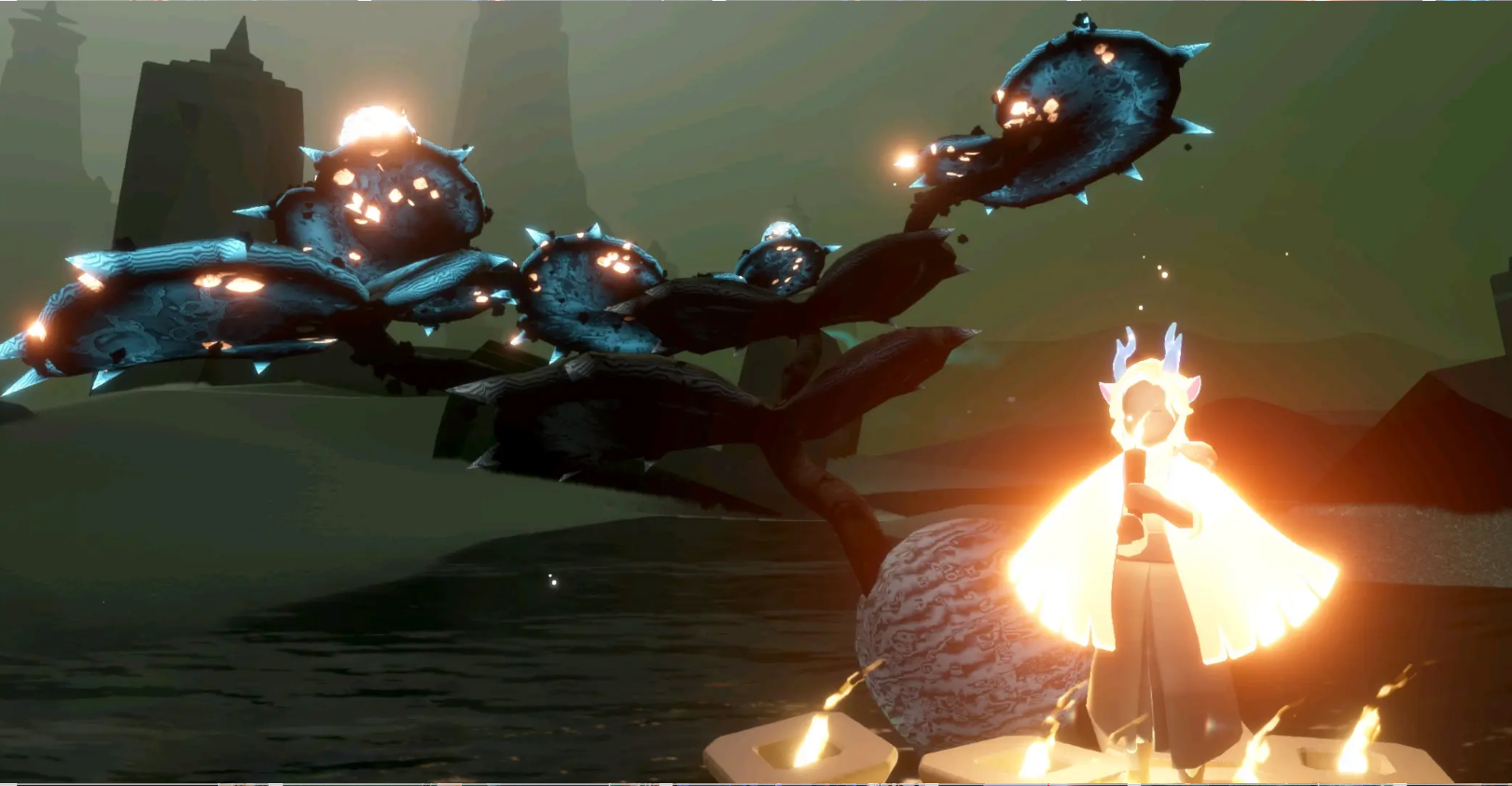 第三张图的难点主要在沉船区域,这里有一只绕着船巡逻的冥龙需要小心应对。可以尝试先飞到船顶的船长室收集烛火回满能量,这样能有足够的能量从侧面滑翔避开冥龙的视线范围。沉船内部其实藏有光之翼,不过需要两人合作点燃黑暗植物才能拿到,如果你是独自行动的话建议暂时跳过这个收集。穿过沉船区域后就可以直奔终点大门了,点燃神坛前的蜡烛并完成跪坐动作就能成功通关整个墓土地图。