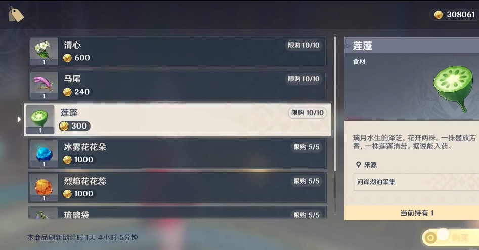 除了自己辛苦跑图去采,还可以直接去买。璃月港里有家叫不卜庐的药店,里面有个叫阿桂的药师就在卖莲蓬。不过药店每天卖的数量有限制,就十个,而且得花摩拉。对于刚开荒、手头紧的旅行者来说,这么买性价比可能不太高,更推荐你应急的时候用。