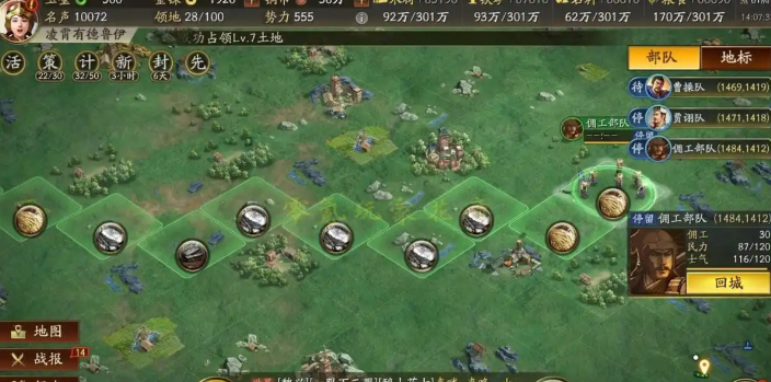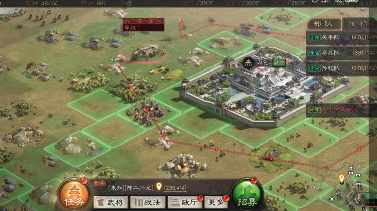 侦查环节绝对不能偷懒,这可是决定胜负的关键一步。咱们得把城市周围的5级地都侦查一遍,看看守军都是什么兵种和武将组合。挑那些兵种适应性低、战法弱的软柿子捏,比如守军是朱俊、蒋钦这类武将的,打起来会轻松很多。第一次打5级地一定要选最简单的,等积累了一些资源和经验后,再去挑战难度高一点的。别急着挑战难度高的,稳扎稳打才是王道。