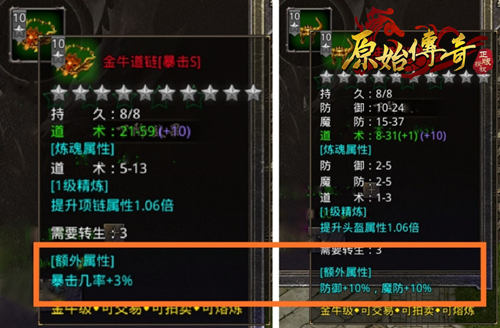 不同类型的原始S级和SS级装备,有着不同类型的额外属性加成,包括暴击、防御、魔防和HP等;